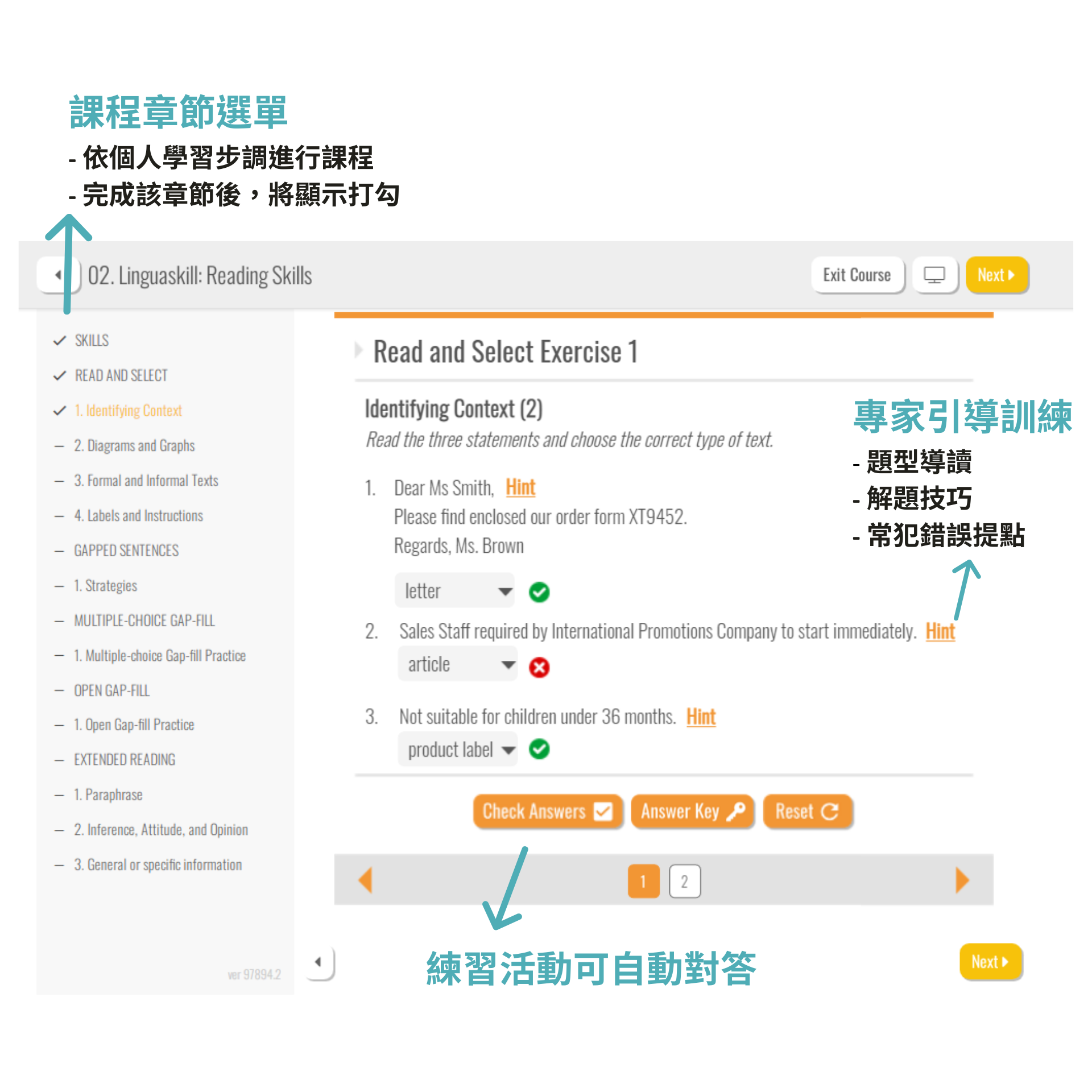 針對一般日常英語提供主題式聽力及閱讀技能訓練,並結合劍橋大數據語言資料庫,提點學習者常犯錯誤,提升學習效率。另結合劍橋領思英檢聽讀項目應考訓練,提供專家題型導讀、解題 tips 窗格及一份全真試題,供考生於考前衝刺階段,全面提升測驗表現。